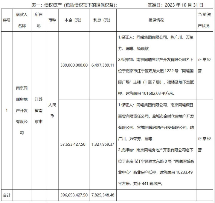 2024年2月,南京同曦房地产开发有限公司债权资产处置公告发布,当时核算的债权利息为782.53万元(截至2023年10月31日),如今已经滚至13049.08万元。