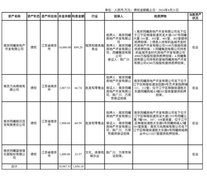 2024年7月,南京同曦房地产开发有限公司等4户不良资产包处置公告发布,4户不良资产分别为南京同曦房地产开发有限公司、南京万尚商城有限公司、南京同曦假日百货有限责任公司、南京同曦篮球俱乐部股份有限公司。