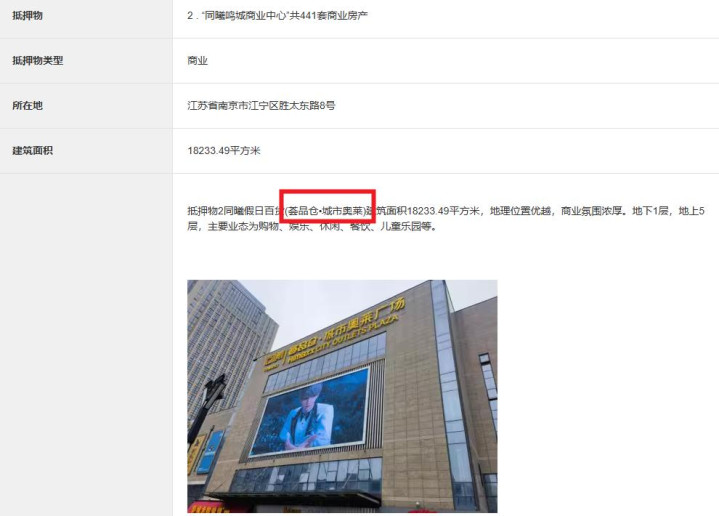 该债权的抵押物,有同曦大瑞新生活广场的主楼、裙楼及地下室;同曦鸣城商业中心共441套商业房产,去年1月开业、建筑面积超1.6万方的荟品仓·城市奥莱所在处也涵盖在内。